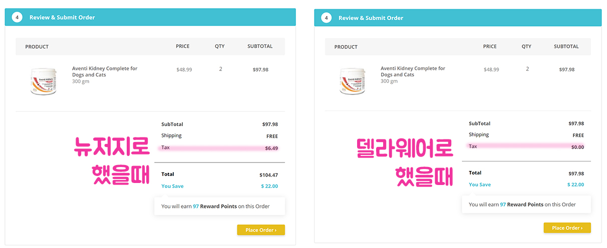 처음엔 생각 없이 뉴저지로 적었는데 세금 따로 붙길래 델라웨어 주소로 수정했다.